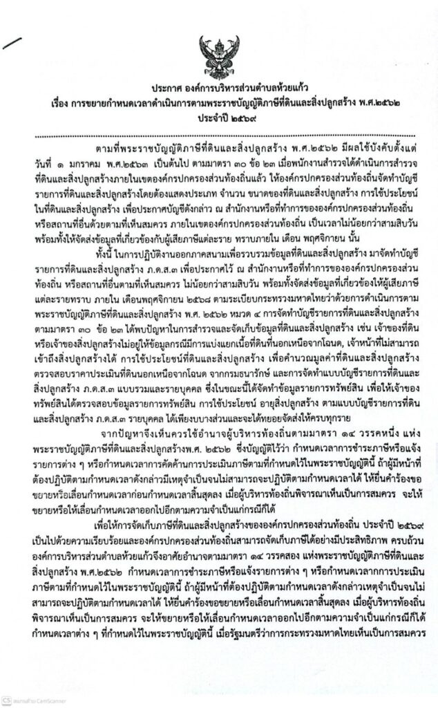 เรื่อง การขยายกำหนดเวลาดำเนินการตามพระราชบัญญัติภาษีที่ดินและสิ่งปลูกสร้าง พ.ศ.2562 ประจำปี 2569