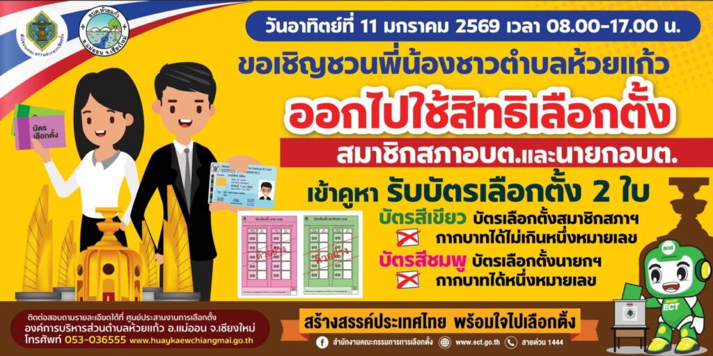 ขอเชิญชวนผู้มีสิทธิ์เลือกตั้งทุกท่านออกมาใช้สิทธิ์เลือกตั้งนายกและสมาชิกสภาองค์การบริหารส่วนตำบลห้วยแก้ว ในวันอาทิตย์ที่ 11 มกราคม 2569 ณ หน่วยเลือกตั้งที่ท่านมีรายชื่อ