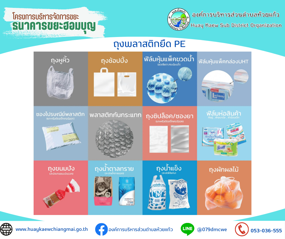 2️⃣ ถุงพลาสติกยืด PE ได้แก่ ถุงหูหิ้ว, ถุงน้ำตาลทราย, ถุงผักผลไม้, ถุงขนมปัง ถุงแกง(ล้างสะอาด) และถุงน้ำแข็ง